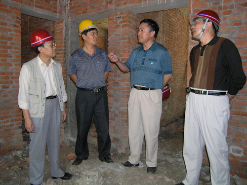 省水利厅移民办叶成林主任(左二)和省审计厅农业审计室吕同仁主任(左一)于9月19日在滁州市、明光市有关部门人员陪同下在潘村湖农场考察移民建房工作。在该场移民建房工地,潘村湖农场场长韩大鸣(右二)向水利厅和审计厅的同志介绍了移民建房工程进展情况。叶、吕两位主任深入施工现场实地考察了工程建设情况,对潘村湖农场抓住机遇,实施移民迁建工程,为洼地职工群众办实事、办好事给予了高度评介,对总体工程进度表示满意。(杨登宏) |