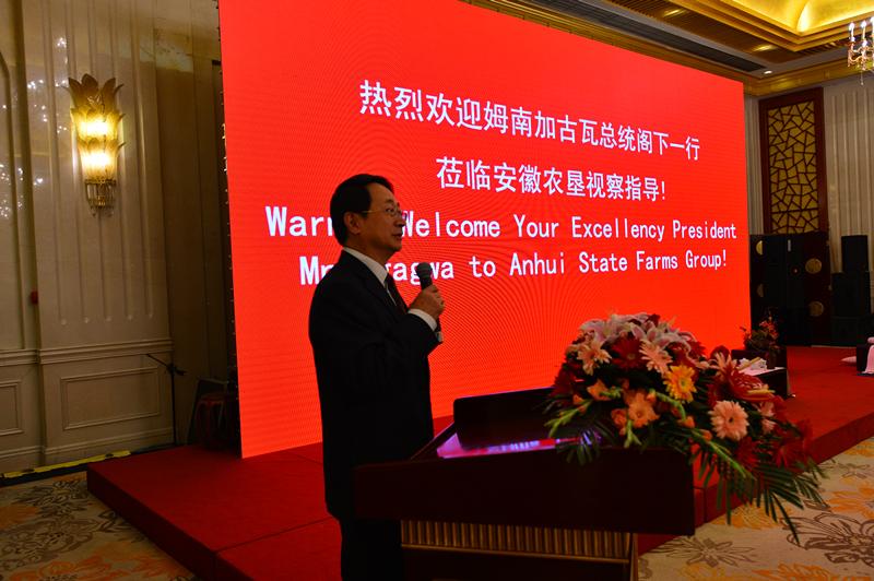 5日,姆南加古瓦一行在副省长周喜安、中国驻津大使黄屏及夫人等陪同下,访问了安徽农垦集团,董事长詹先豪、总经理刘超、副总经理陈仁虎等在稻香楼宾馆接待厅礼迎贵宾,陪同观看安徽农垦在津巴布韦开垦农场的宣传展板和农垦系列安徽农垦集团。展台前,詹先豪向来宾介绍了农垦产品品牌和质量情况,总统一行对农垦产品表示出极大兴趣,对双黄鸡蛋、倮倮大米等大加赞誉。来宾观看了安徽农垦宣传片及安徽茶艺表演,听取了皖津项目发展情况汇报,詹先豪向总统及夫人赠送了礼品。访问即将结束时,姆南加古瓦总统现场发表了即兴讲话,对津巴布韦代表团考察访问的热情友好接待表示感谢,对安徽皖津公司履行社会责任方面所做的贡献表示赞赏,对安徽农垦集团下一步在津巴布韦的项目开发和业务拓展表示给予更大更多支持。