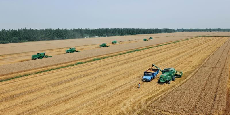 面对今年极端天气形势的影响,为确保粮食颗粒归仓,安徽农垦把“抢收保种”作为攻坚任务,投入大型联合收割机械、拖拉机等农机具5000台套奋力抢收,实现了小麦全程机械化。图为寿西湖农场农机会战现场。(人民日报2016年6月12日10版,鲍广云摄)