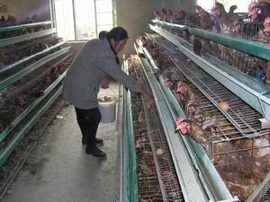 说明:曾获得全国农林系统优秀女职工称号的潘村 湖农场三分场职工王文梅积极发展自营经济,取得 明显成效。目前,她除承种了近百亩耕地外,还养 殖了1200只蛋鸡和几头母猪。家里建造了沼气池, 初步形成了种植、养殖和销售为一体的循环经济发 展格局。2004年,仅自营经济一项,王文梅家庭农 场就获纯收入近5万元。图为王文梅在鸡场收获鸡蛋 的情景。(杨登宏摄)
