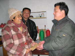 该公司党委副书记刘盛旭、委员杨双景、李双陆三 路,翻山绕岭,进村入队,踩着泥泞山路,登门慰 问。在慰问中,他们都要查看每家每户的住房,床 单、厨房、米桶,亲切地问他们需要什么,盼什 么。